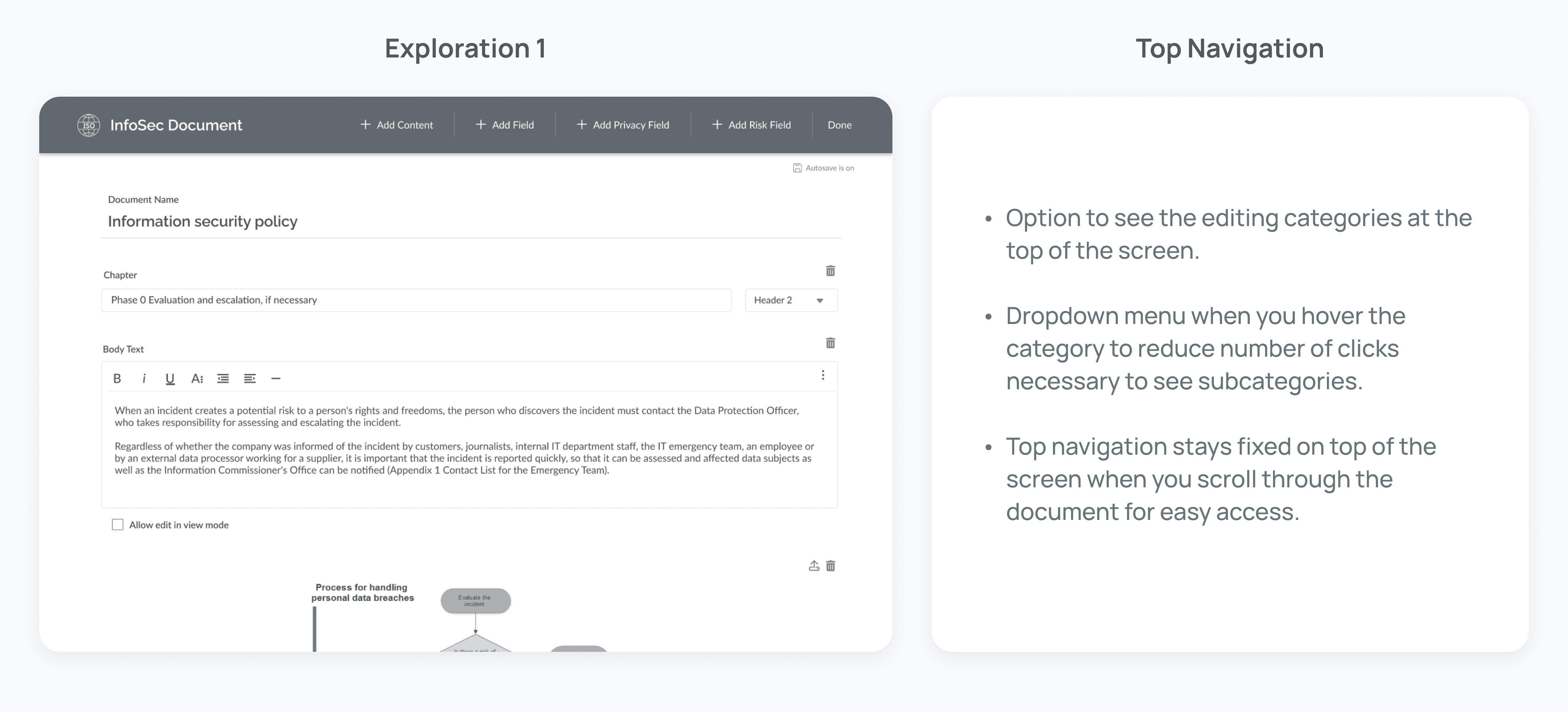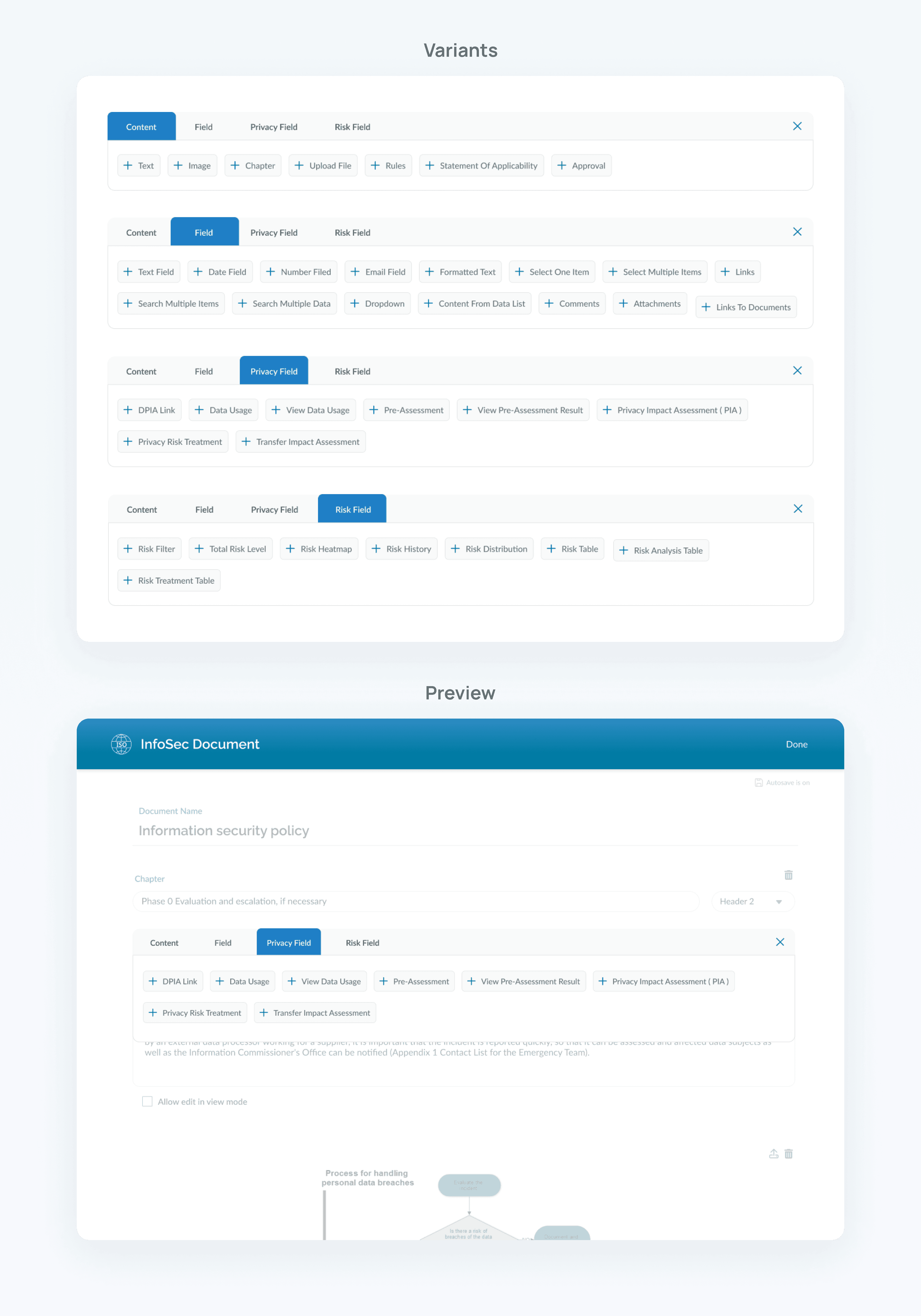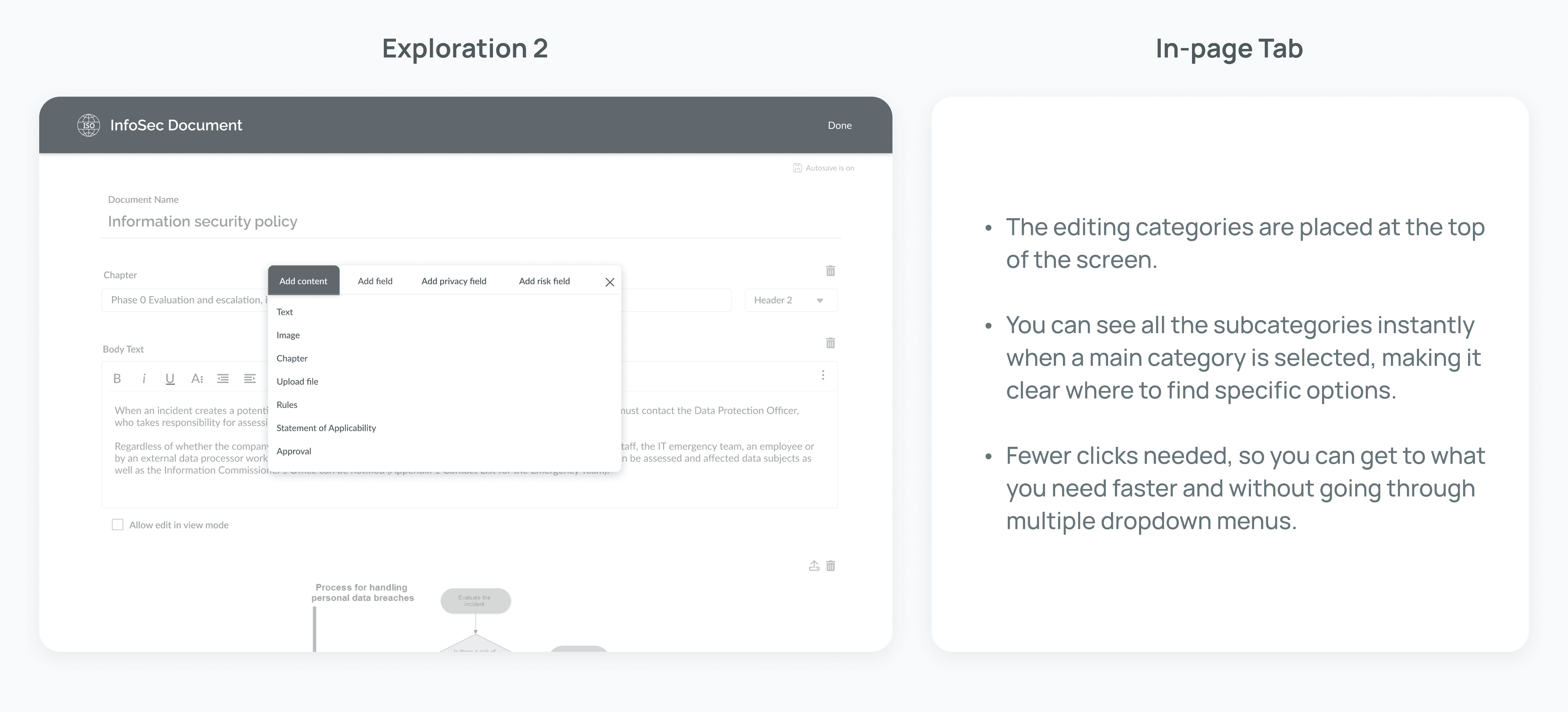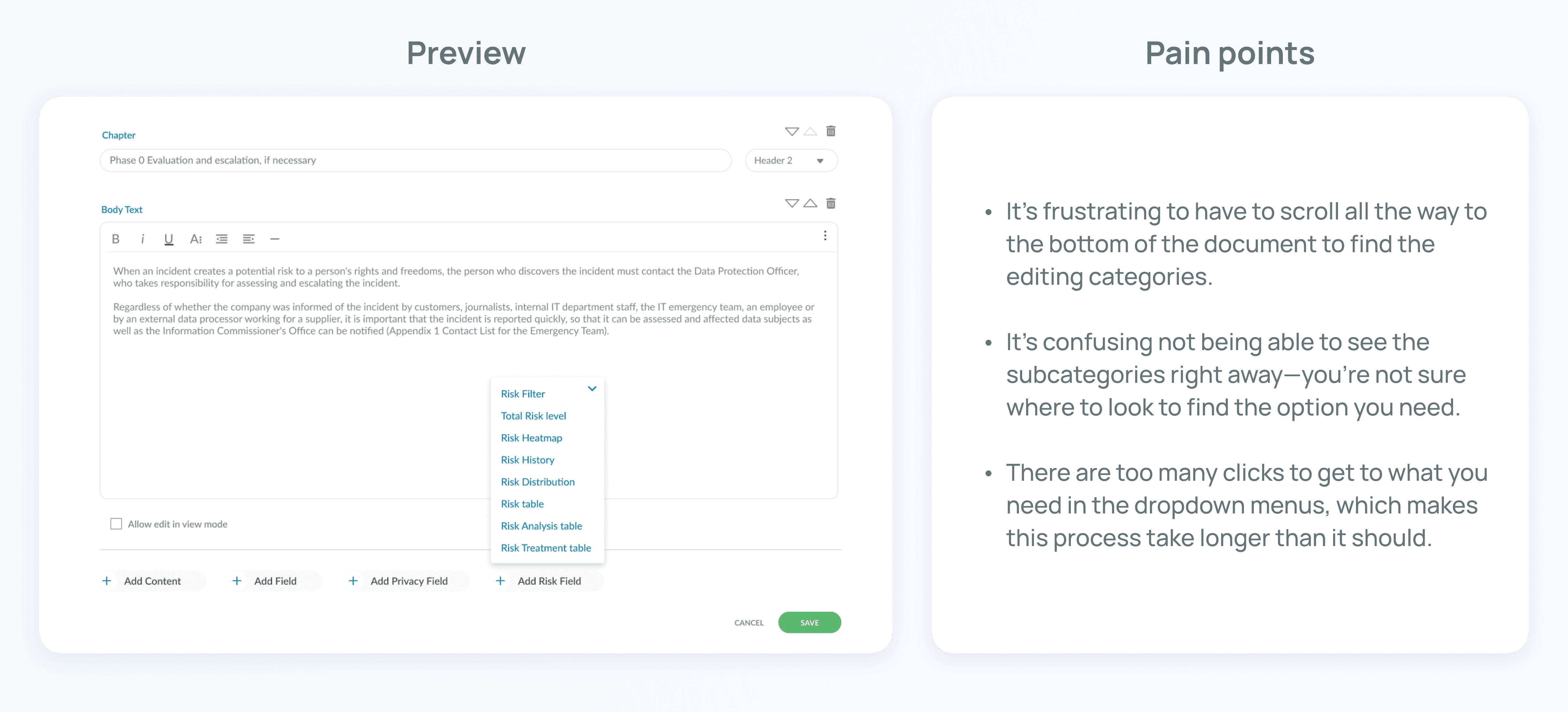 NeupartOne is an all-in-one tool that helps organizations manage compliance with features like risk management, task automation, and 50+ ready-made templates for ISO 27001/2 and GDPR. Our redesign focused on making the document editing process easier and more efficient, so users can update and track compliance documents smoothly and respond quickly to audits and new regulations.