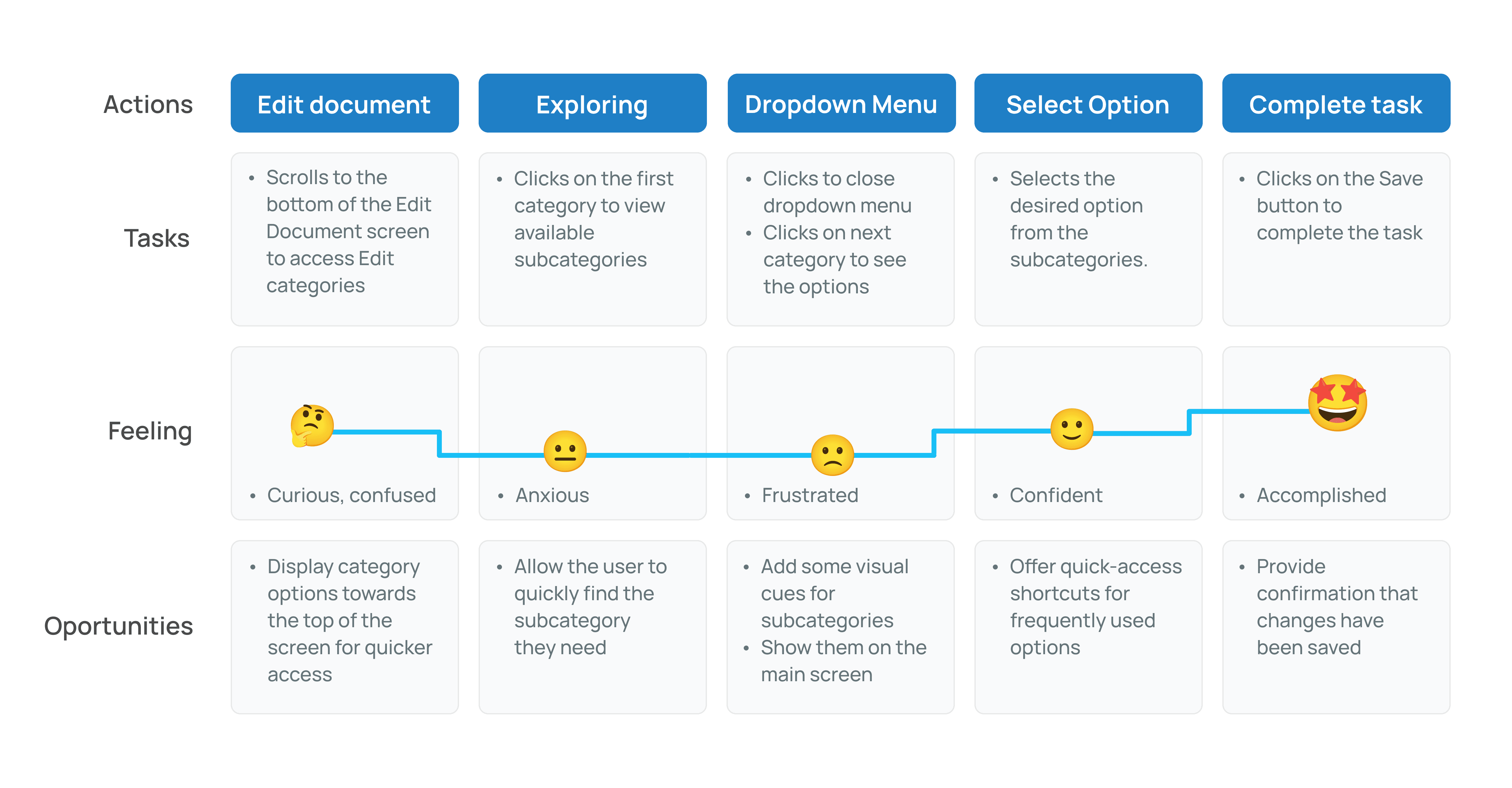 Next, I mapped out the existing journey for editing documents to pin point opportunities for improvement. This step was crucial in understanding where users experienced friction and where we could introduce improvements.