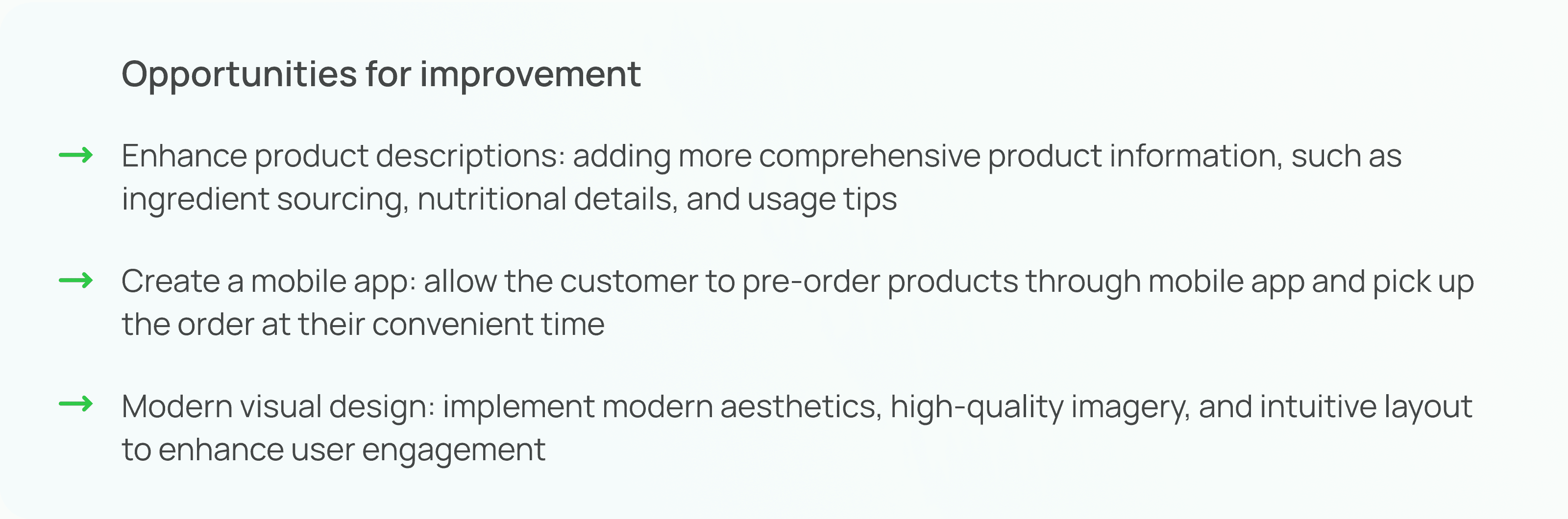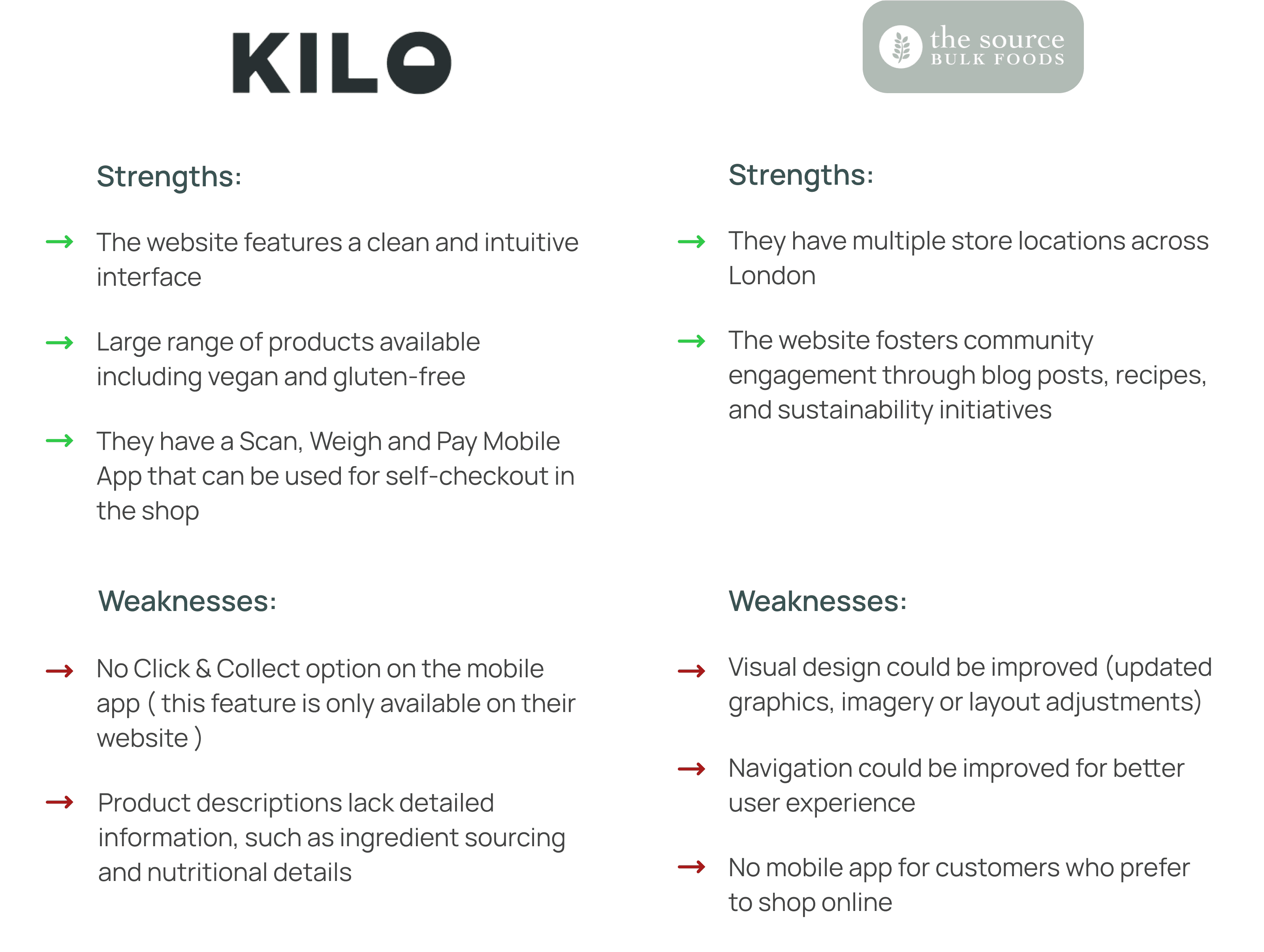 Conducting competitive analysis helped me understand what users expect, to spot industry trends as well as to reveal opportunities for differentiation and improvement. Through market research, I identified two main competitors ( Kilo and The Source Bulk Food ) and evaluated their strengths and weaknesses in order to see how The Zero-waste Shop can fill any gaps.